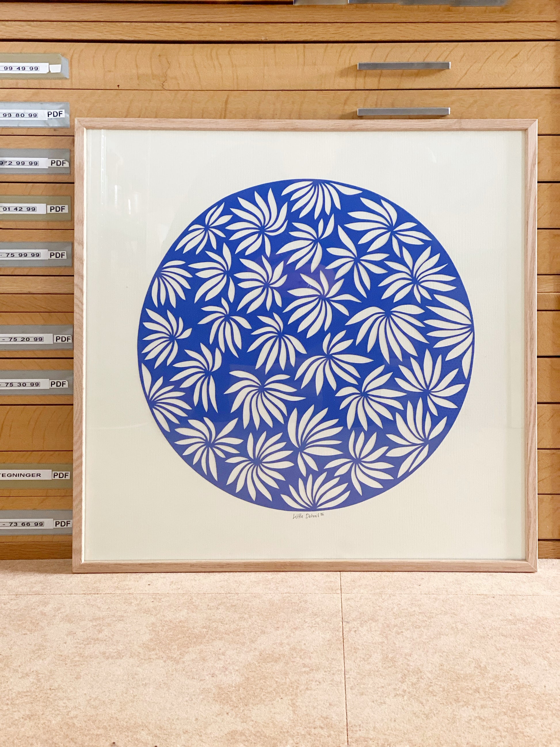 50x50 kongeblåt papercut på creme baggrund.